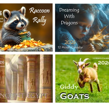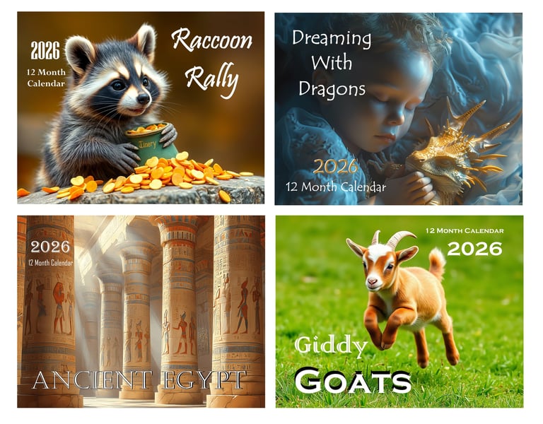I'd say we are off to a good start, as Raccoon Rally, Dreaming with Dragons, Ancient Egypt and Giddy Goats have been added to our collection. I hope you find one of these new designs to your liking, or maybe you know the perfect person who would love to receive one of these new calendars as a gift. If not, check out our previous year designs that have been updated for 2026.